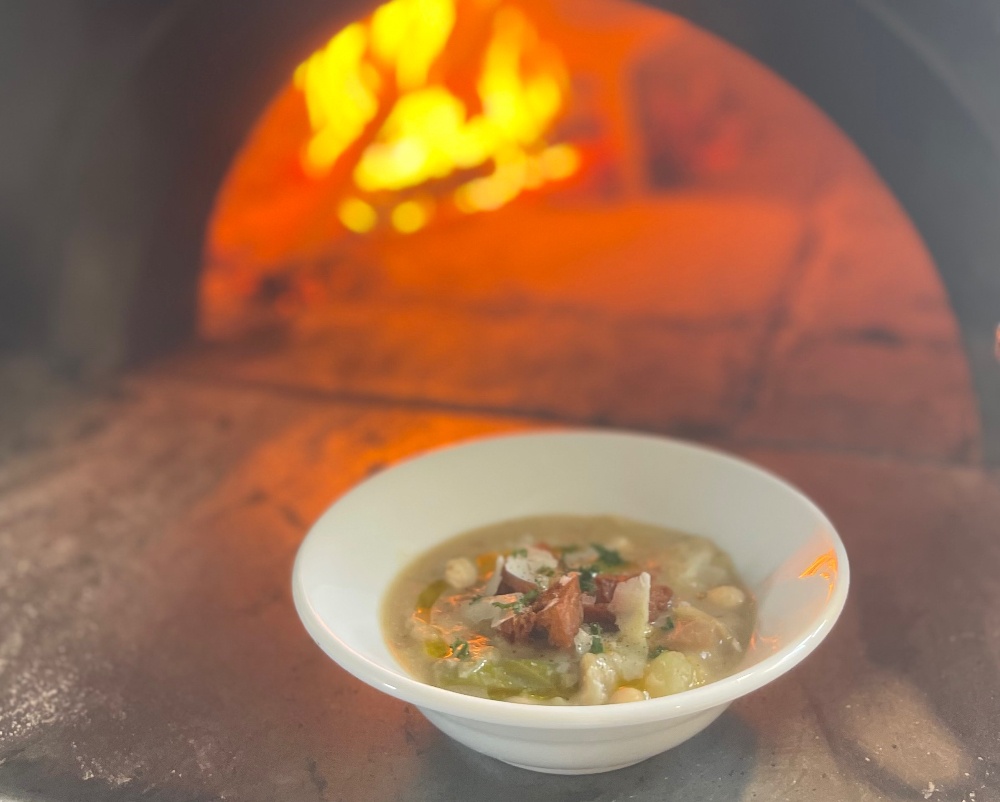 石窯の火のある店で、